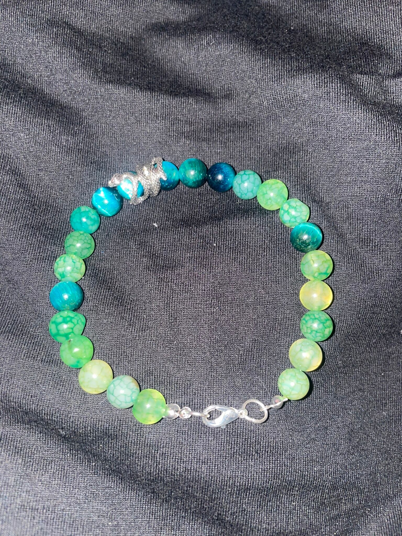 グリーンのタイガーアイと血脈のようなデザインのビーズでグラデーションを作り、中央に巻きついた蛇を配置しました。